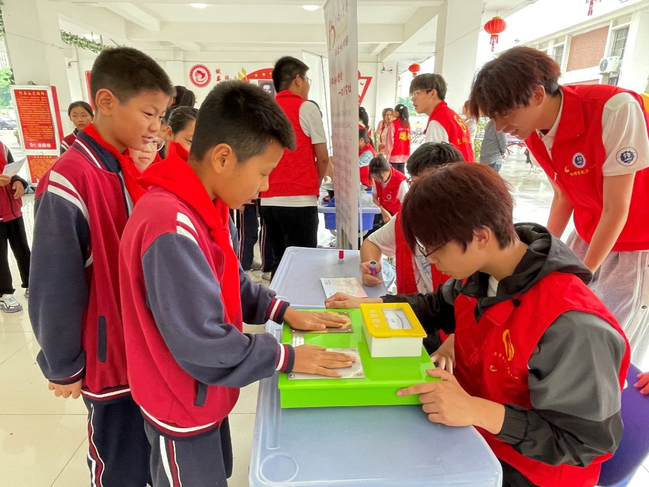 在延乔路小学校园中,来自合工大应用物理学专业和安中医应用心理学专业的大学生党团员志愿者,为少先队员们打造了一条“科普文化长廊”,进行科普实验展示和传统文化宣讲。