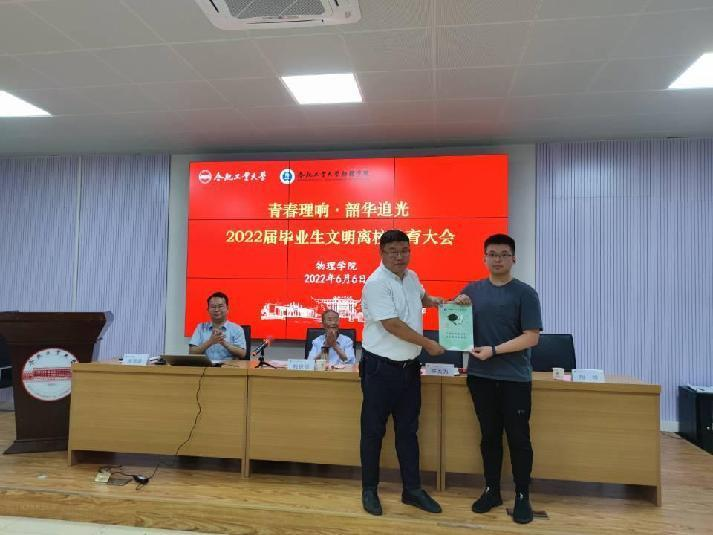 大会在校歌中拉开帷幕。2019级研究生团支部书记、校优秀毕业生葛菲菲代表毕业生发出文明离校倡议,号召大家“安全离校、文明离校、有序离校、圆满离校、感恩离校、平和离校”,各毕业班班长代表全体毕业生向学院领导递交《文明离校承诺书》,随后与会领导向应用物理学18-1班张雷等五名第二课堂活动优秀代表颁发了《第二课堂成绩单》。