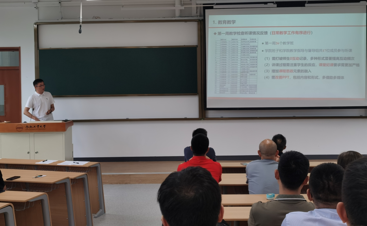 会议首先对学院前期教学工作进行全面总结,既肯定本科生、研究生教学在学科建设、教学改革、人才培养等方面的阶段性成果,也客观梳理当前工作中的不足与改进方向;随后通报了新学期第一周教学检查结果与反馈意见,并围绕课程优化、教学团队建设、学生实践能力培养和教学质量监控等关键环节,明确新学期教学任务具体要求。