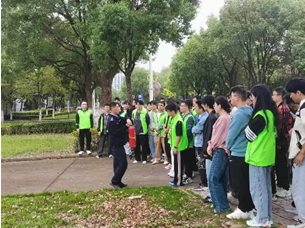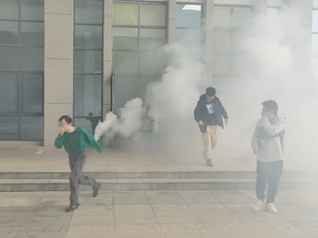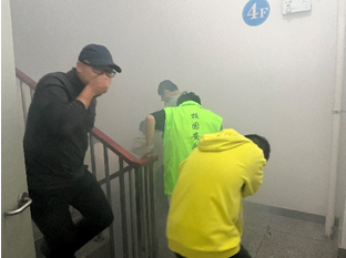 讲座结束各学院的师生回到各自的实验室,开始在科教楼D座1-6层进行安全疏散演练,随着模拟火情警报哨声从1楼响起,实战演练正式开始,现场浓烟(模拟)弥漫,气氛紧张。在现场保卫人员、教师及研究生志愿者的有序指挥与引导下,参与演练的学生们反应迅速,沉着冷静,严格按照预定疏散路线,低姿弯腰,有的同学还用衣服捂住口鼻,快速而有序地撤离至安全区域,整个疏散过程三个学院的师生配合紧密有序,完成了逃生演练。