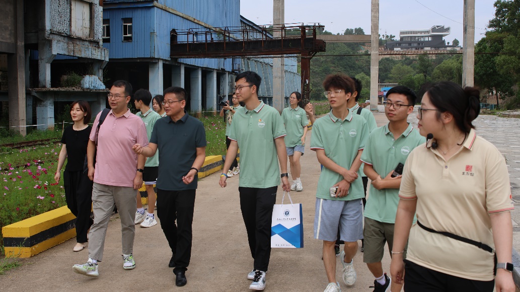 “明理”宣讲团首先来到了铜川市王石凹煤矿工业遗址。在王石凹街道党委书记吕治国的带领下,宣讲团参观了遗址内的国家工业遗产,并看到了煤矿遗址正在改造建设的老工业风景区。通过吕书记的介绍,宣讲团成员们知道了王石凹煤矿是国家“一五”期间156个重点工程建设项目之一,由前苏联列宁格勒设计院援建, 1961年建成移交生产,是当时我国西北地区的第一座最大的机械化竖井。为了保护生态环境,王石凹煤矿现在已经全部关停,并于2018年列入第二批国家工业遗产名单。走在矿区的小路上,看着高高耸立的选煤楼,宣讲团成员了解了国家煤矿工业发展的历史,也见证了矿业遗址公园的建设。王石凹煤矿从矿区到遗址公园的转变积极响应了国家绿色发展的政策,不仅有利于改善当地的环境,还能够借助其得天独厚的区位、气候和交通优势,为铜川市旅游产业的发展带来助力,能够带来极大的经济效益。通过王石凹遗址公园的建设,宣讲团成员们对“绿水青山就是金山银山”这句话有了更加深入的理解。
