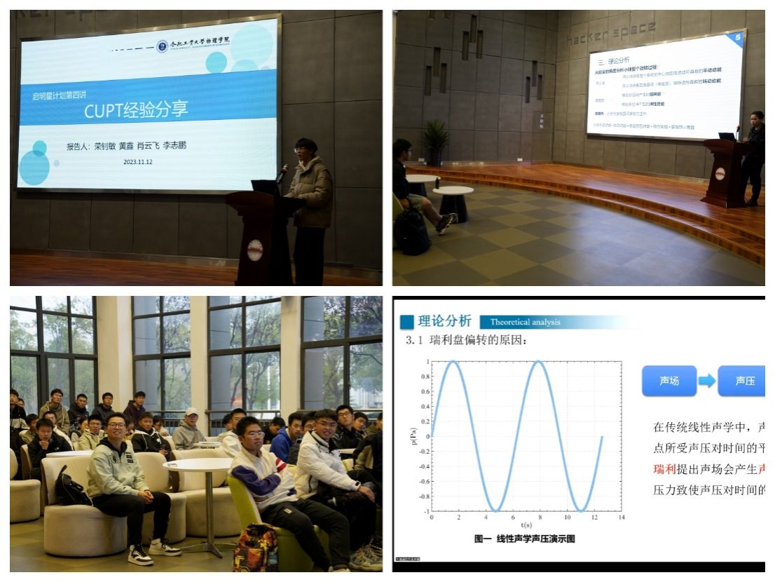 本次分享会上,中国大学生物理学术竞赛三等奖、华东赛区一等奖获得者荣钊敏借助他的获奖作品“瑞利盘”和“竹蜻蜓飞行状态研究”,向同学们详细介绍了参赛作品的形式和汇报要求。安徽省大学生物理学术竞赛一等奖获得者李志鹏通过他的获奖作品“橡皮筋上的球”,向同学们分享了参考资料的找寻方法以及参赛题目的选择思路。安徽省大学生物理学术竞赛二等奖获得者黄鑫通过他的获奖作品“膜上球”,分享了实验当中的注意事项和技巧以及一些对实验有帮助的软件。安徽省大学生物理学术竞赛三等奖获得者肖云飞以他自己亲身的经历,介绍了参赛的准备事项,评委老师评分的主要标准,以及参赛的具体流程。