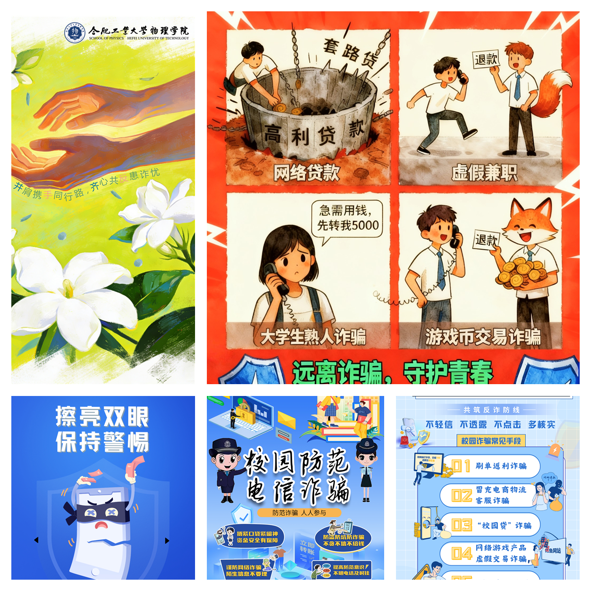 大赛自启动以来,得到全院学生的积极响应与广泛参与。同学们紧扣“反诈”核心主题,聚焦刷单返利、网络交友、虚假兼职、校园贷等校园高发诈骗类型,充分发挥创意才华,将反诈知识与视觉艺术相结合,精心设计提交了一批主题鲜明、构思新颖、警示性强的海报作品。作品通过简洁有力的图文搭配、生动形象的场景再现,直观揭示诈骗套路,清晰传递防诈要点,既展现了物理学子的艺术素养,更彰显了青年一代参与安全建设的责任担当。