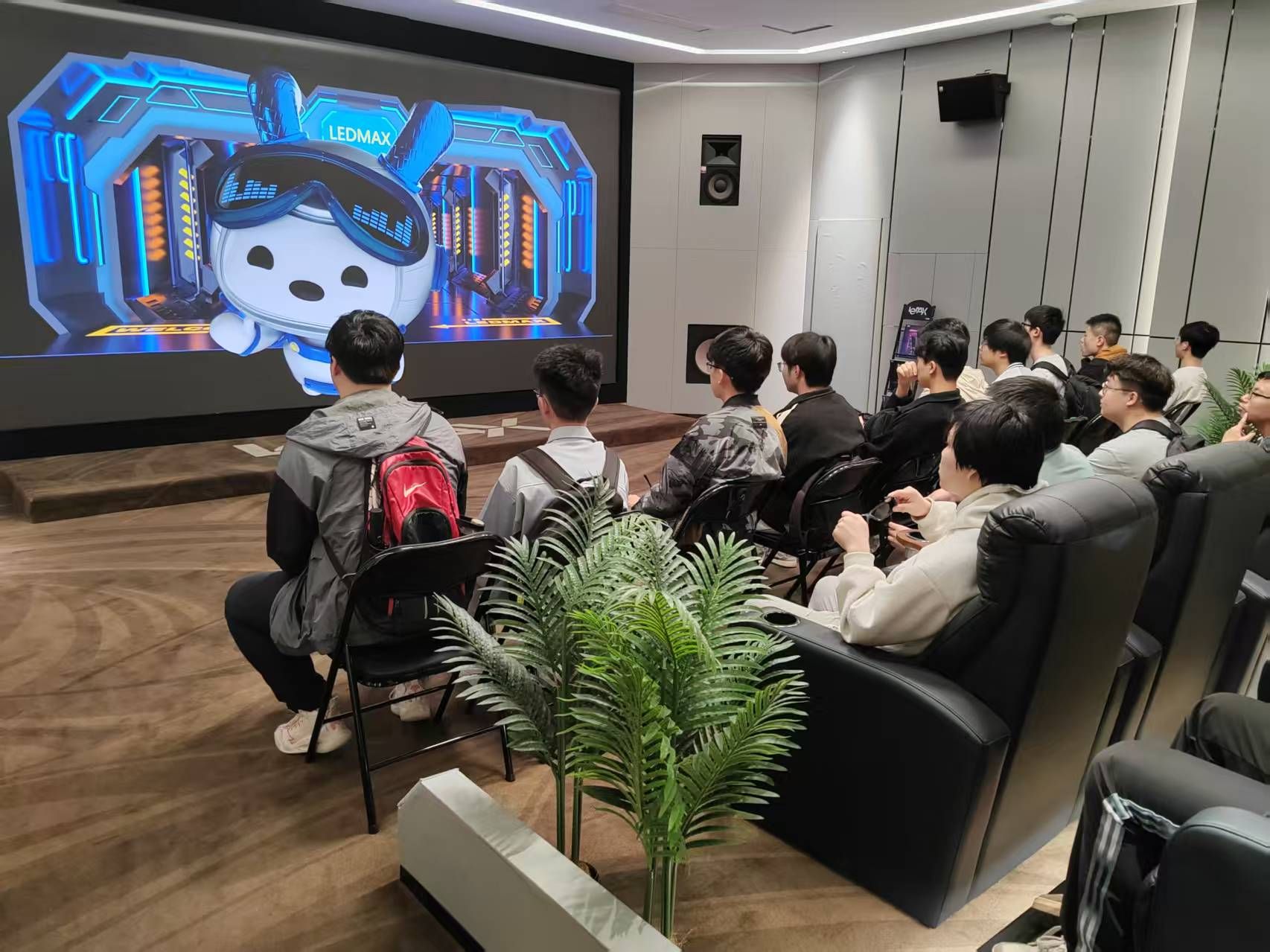 在技术人员的带领下,同学们首先踏入洛普公司的 DCI 电影厅。高清流畅的影像、细腻逼真的色彩与震撼的音效完美融合,带来极具冲击力的视听享受,让同学们对 LED 显示技术的高清画质与强大表现力赞叹不已。随后,同学们进入巨幅LED 球幕展厅,开启了一场奇妙的 “环球之旅”。360 度环形屏幕上,《飞跃江苏》与《飞跃芝加哥》两部影片依次播放。从江苏的秀美山水、繁华都市,到芝加哥的摩天大楼、异域风情,动态画面令同学们身临其境,不禁惊叹于洛普公司在球幕显示技术上的精湛工艺与创新实力。