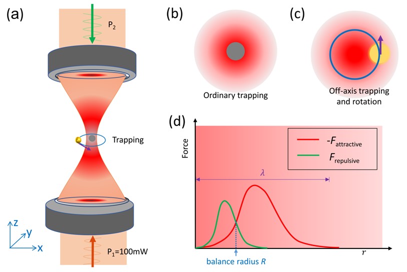 图1 研究方案示意图和机理图。(a)通过紧聚焦高斯光束对颗粒进行光学捕获和轨道旋转的装置示意图。(b)常规的光学捕获将颗粒捕获在光斑中心。(c)本研究的方案可以将颗粒捕获在离轴位置且进行旋转。(d)离轴捕获和轨道旋转的原理:两种不同波长的激光束对颗粒在径向方向上由于等离子体共振现象可以施加相反方向的力(绿色和红色线表示),两个力平衡时即可将颗粒捕获在离轴位置;光束由于紧聚焦产生的角向动量进一步驱动颗粒使其进行轨道旋转。