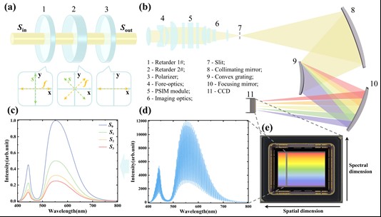 图 1 通道型偏振光谱仪光学结构及测量原理 (a) PSIM模块结构示意;(b) 基于Offner型光栅光谱仪的CSP光学系统;(c) 解调获得的目标Stokes参量光谱;(d) 测量的调制光谱;(e) 面阵CCD获取的二维信息