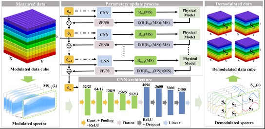 近日,我院光场调控与微纳光子学团队在光谱偏振信息实时高精度获取方向取得新进展,相关研究成果以“Physics-guided neural network for channeled spectropolarimeter spectral reconstruction”为题,发表在《Optics Express》(31(15), 24387-24403 (2023))上。