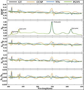 针对上述问题,胡继刚教授团队利用CSP物理模型蕴含的先验信息结合深度神经网络(DNN)强大的建模能力,设计了一种物理引导型神经网络(PGNN),实现了对调制数据的超高精度快速解调,其工作流程如图2所示。与传统基于DNN的方法不同,PGNN的网络参数始于随机赋值,并由梯度下降算法获得其精确估计,从而建立调制光谱与Stokes参量光谱的映射关系。物理模型在网络参数优化过程中主要起约束作用,对DNN输出结果进行物理引导。该工作结合仿真与实验验证了PGNN对调制光谱的超高精度快速解调能力,其对紧凑型荧光灯光源的调制光谱解调结果如图3所示。相关研究成果为推动CSP的高性能应用提供了有效方案,也为其他同类型光谱成像设备的高精度数据获取提供了新方法。