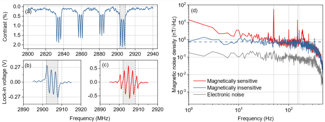 NV色心是近年来最具有潜力的量子精密测量体系之一,基于NV色心系综可在室温条件下实现对亚纳特斯拉量级DC磁场的精准探测。该工作基于FPGA技术开发了一块多功能小型化板卡,将数据采集卡、信号源、锁相放大器等仪器功能集成一体。同时,基于Python语言开发了PC上位机软件,该系统几乎可以实现全自动的实验测试流程,与人工智能、机器学习等领域相结合,有望进一步发掘NV色心系综磁力计的极限灵敏度。
