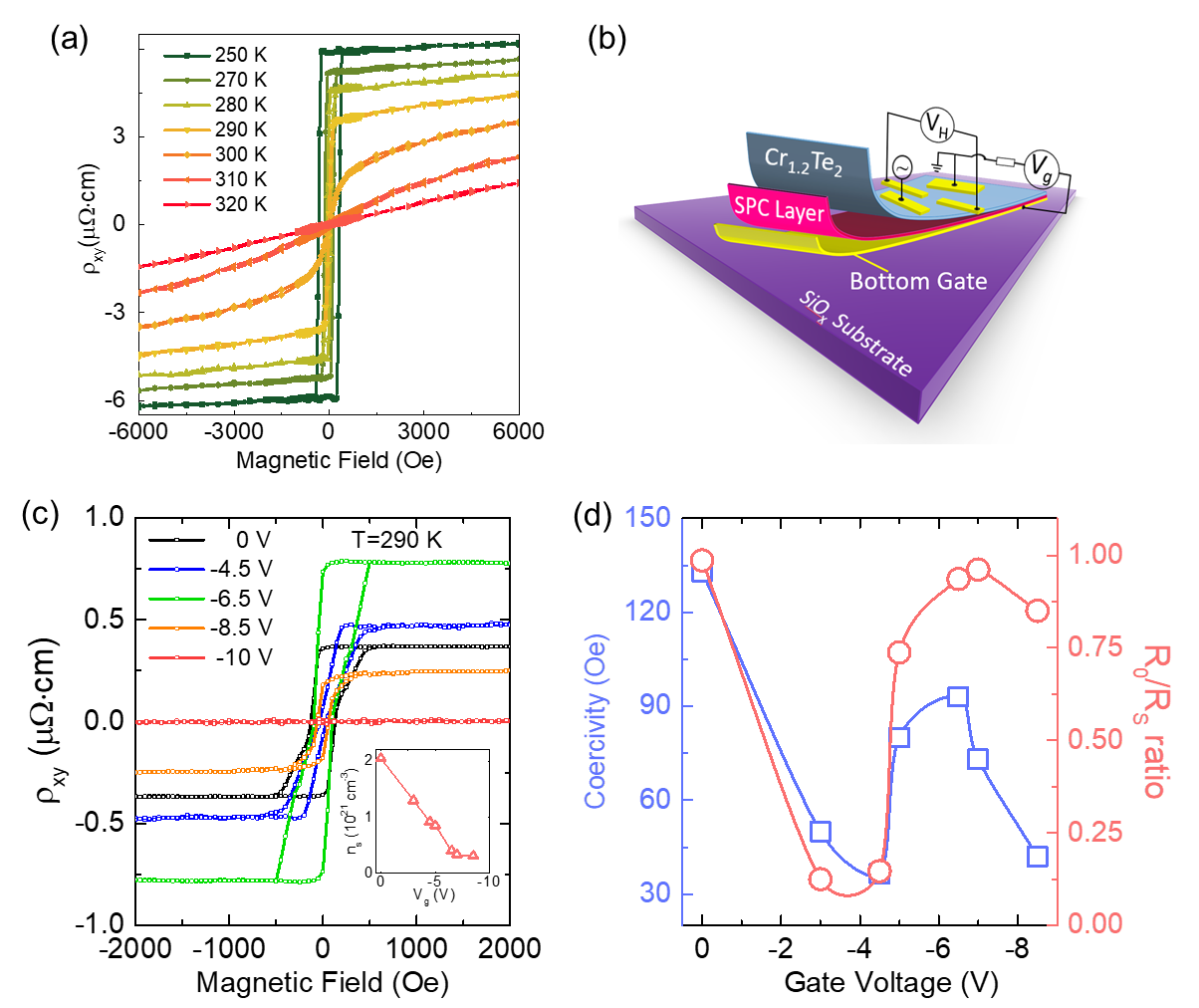 图2.(a)不同温度下的43-nm Cr1.2Te2纳米片反常霍尔效应曲线。(b)基于vdW磁体Cr1.2Te2的固态质子栅控器件示意图,其中Cr1.2Te2薄片位于固态质子导体上,Pt薄膜用作背栅电极。(c)在290 K下,不同栅极电压下的反常霍尔效应曲线。(d)Cr1.2Te2矫顽力和R0/RS电阻比随着栅极电压的变化关系。