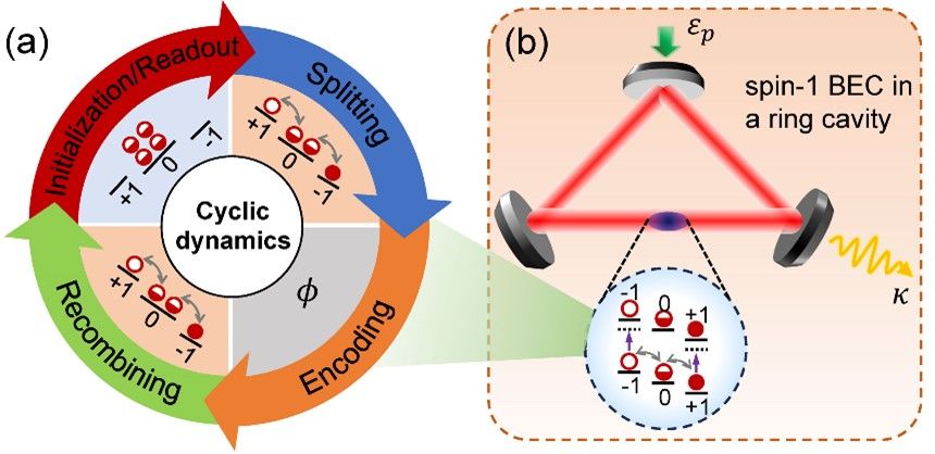 针对上述问题,我院量子精密测量团队提出了基于光学腔的自旋为1的旋量玻色-爱因斯坦凝聚体非线性干涉仪,利用旋量凝聚体的自旋交换相互作用和系统内禀周期自旋混合动力学,实现非线性原子干涉仪的分束与合束,并研究了编码相位、分束与合束时间对干涉仪灵敏度的影响,利用腔-原子的非线性效应,实现光学腔协助的灵敏度增强的非线性原子干涉仪。