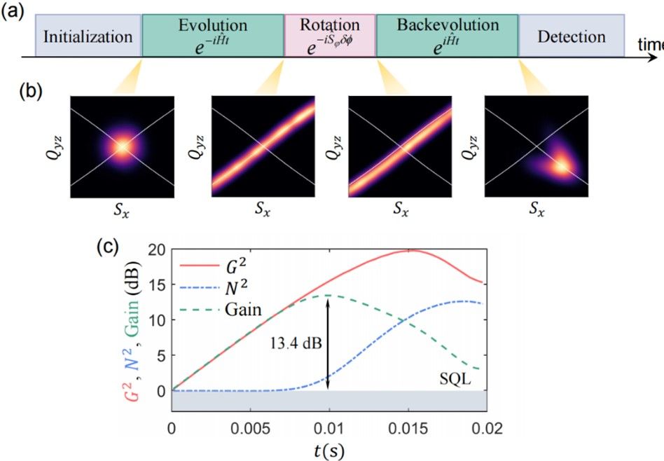 图3.(a)基于时间反演模型的量子传感。(b)不同阶段态的动力学演化。(c)信号放大增益和噪声随时间的变化。