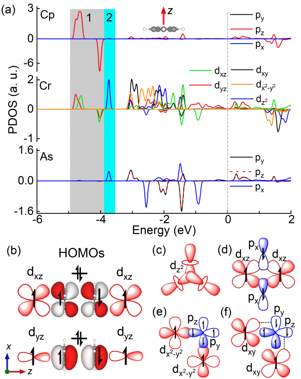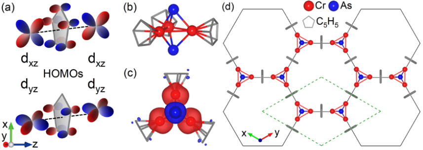 为了突破上述限制,研究团队提出使用环戊二烯基(Cp)作为p轨道的主体,基于团簇自组装概念,构建了一类二维磁性 (Cr3As2)2Cp3团簇类烯,如图1所示。根据分子理论,由于Cp的两个简并的最高占据分子轨道和dxz/yz轨道属于同一种不可约表示(E′′)基函数,dxz/yz(|Lz|=1)轨道可以与Cp的最高占据分子轨道发生巨大重叠,增强d-p-d超交换相互作用。另一方面,d轨道与Cp的最高占据分子轨道之间的强相互作用可增强d电子离域化程度,使dxz/yz能量提升至费米能级附近,实现自旋极化的价带和导带的磁量子数匹配(|∆Lz|=0)。