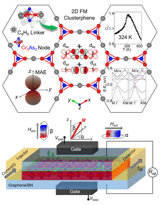 基于密度泛函理论的第一性原理计算结果表明,Cr原子的dxz/yz轨道与Cp的最高占据分子轨道产生了强的相互作用(图2),极大增强了d-p-d超交换作用,使(Cr3As2)2Cp3团簇类烯的磁转变温度达到室温条件(TC = 324 K)。(Cr3As2)2Cp3 团簇类烯同时具有易磁面,面内为各向同性,属于理想的XY铁磁体,表现出巨磁-能带结构效应,预期有望在实验上通过外加磁场调控磁矩方向以改变能带结构,实现量子反常霍尔效应(图3)。此外,研究团队采用官能团和元素修饰策略进一步调控了磁各向异性和巨磁-能带结构效应。最后,研究团队利用获得的上述性质,构建了基于(Cr3As2)2Cp3团簇类烯的二维自旋电子器件,模拟隧穿各向异性磁阻和量子反常霍尔效应(图3)。本工作将推动具有室温磁转变温度的二维XY铁磁半导体的理论设计、实验制备及其器件应用研究。