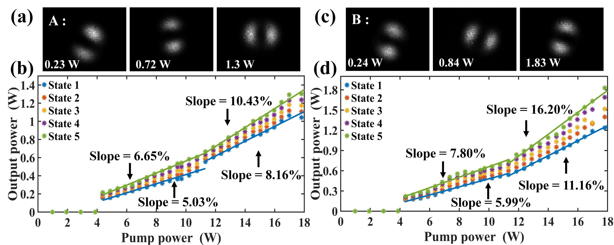 在该研究的实验过程中还发现,当泵浦光功率超过11.5W时,LP₀₁与LP₁₁模的周期性拍频引发横向孔烧效应,促使能量从基模向高阶模转移,形成光学诱导长周期光栅(Optically Induced Long Period Grating, OLPG),将激光器的单端输出斜率效率提升至16.20%,总输出效率达25.03%。激光器的单端最大输出功率1.83W,总输出功率2.93W。