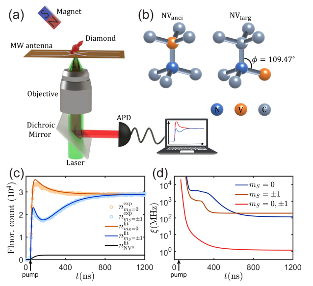 图:(a) 基于耗散动力学的时间分辨荧光测量原理示意;(b) 通过速率方程模型重建磁场方向与强度;(c) 、(d)实验荧光曲线与理论拟合结果的对比。