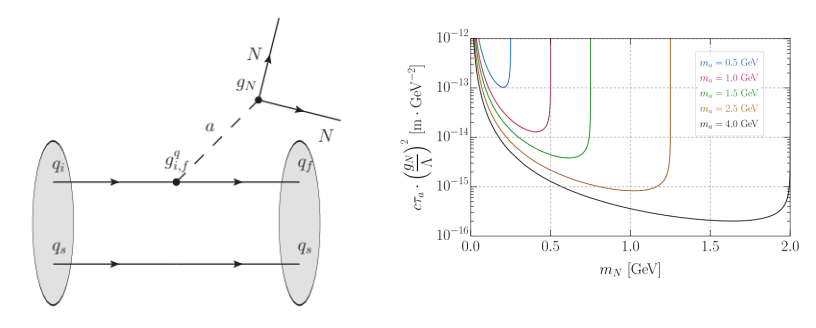 Recently, Associate Researcher Zeren Simon Wang and Associate Professor Yu Zhang from our school, in collaboration with Associate Professor Wei Liu from Nanjing University of Science and Technology, have evaluated the sensitivity of several present and future experiments to HNLs coupled to ALPs. Specifically, the authors focused on ALPs coupled to SM quarks off-diagonally, produced in meson decays and subsequently decaying into a pair of long-lived HNLs (Figure 1, left). Additionally, depending on the coupling strength between the ALP and HNLs, the ALP can either decay promptly or have a long lifetime. Figure 1 (right) shows the proper decay length of the ALP as functions of the ALP-HNL coupling strength, ALP mass, and HNL mass.